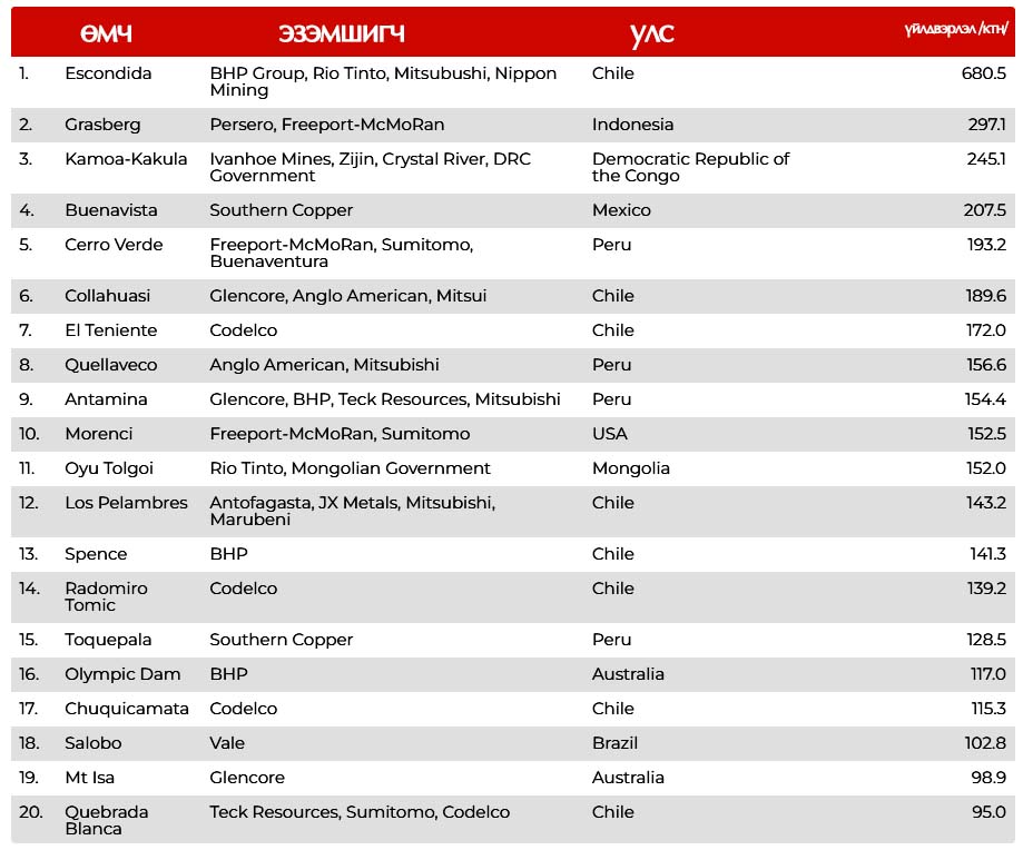 Монголын Оюу толгой топ 20 зэс олборлогч уурхайн 11-т жагсавэ. Рио Тинто Монголын Засгийн газрын эзэмшдэг Оюутолгой 6-р сарын 30 хүртэл 152,000 тонн зэс олборлосон. 2028-2036 онд дунджаар 500,000 тонн зэс нийлүүлнэ гэж мэдэгдэв.