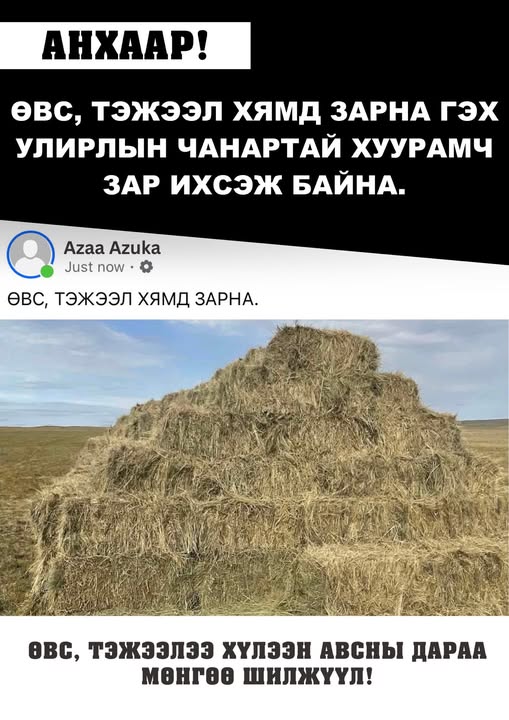Хүйтний улирал эхэлсэнтэй холбогдуулж, эрэлтэд тулгуурлан “Өвс, тэжээл зарна” хэмээн залилах болжээ. Олон нийтийн сүлжээнд “Өвс, тэжээл хямд зарна” гэх хуурамч зар олширч байгааг цадаагийн байгууллага мэдээллээ. Иймд иргэдийг сонор сэрэмжтэй байж, өвс, тэжээлээ бодитоор хүлээн авсны дараа төлбөрөө шилжүүлэх, урьдчилгаа мөнгө шилжүүлэхгүй байхыг анхаарууллаа.
