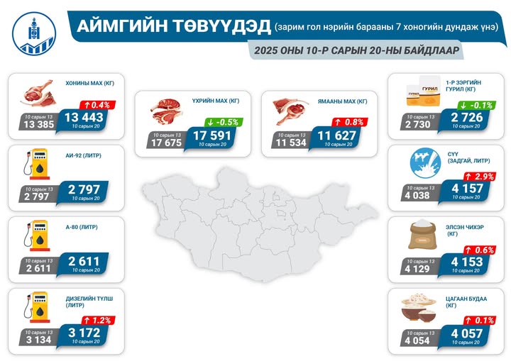 Аймгийн төвүүдэд зарагдаж байгаа гол нэрийн зарим хүнсний бүтээгдэхүүний үнийг мэдээллийг 2025 оны аравдугаар сарын 20-ны өдрийн байдлаар хонины мах кг нь 13443 төгрөг, үхрийн мах кг 17591 төгрөг, ямааны мах кг 11627 төгрөгөөр тус тус худалдаалж байна. Мөн нэгдүгээр зэргийн гурил кг 2726төгрөг, сүү /задгай, литр/ 4157 төгрөг, элсэн чихэр кг 4153 төгрөг, цагаан будаа кг 4057 төгрөгийн үнэтэй байгаа байгаа юм.