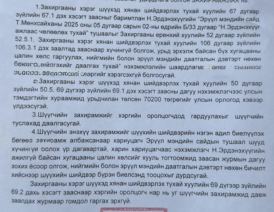 Харин өмнөх Эрүүл мэндийн сайдын дээрх шийдвэрийг эсэргүүцэж, Н.Эрдэнэхүү шүүхэд хандсан байсан юм. Тэгвэл шүүхээс ХСҮТ-ийн даргаар ажиллаж байсан Н.Эрдэнэхүүг ажлаас чөлөөлсөн ЭМ-ийн сайд асан Т.Мөнхсайханы шийдвэрийг хүчингүй болгож, Н.Эрдэнэхүүг ажилд нь буцаан томилж, ажилгүй байсан хугацааны цалинг нөхөн олгох шийдвэр гаргасан байна.
