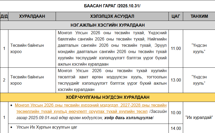 Өнөөдөр чуулганаар Төсвийн хүрээний мэдэгдэл хэлэлцэгдэх хуваарь гарсан байна. Удтал хэлэлцүүлэг нь хойшилсон 2026 оны төсвийн хууль одооноос эрчимтэй хэлэлцэгдэх төлөвтэй боллоо. Өмнө нь баасан гариг бүрийн хоёрдугаар хагаст чуулганаар Ерөнхий сайдын цаг байсан бол УИХ-ын гишүүн Х.Тэмүүжин нарын санаачилгаар УИХ-ын гишүүдийн асуулгын цаг болсон юм. Өнөөдөр байнгын хороогоор төсвийн хуулийн 3 дахь хэлэлцүүлэг орохоор хүлээгдэж байгаа ч одоогоор байнгын хорооны хурал төлөвлөөгүй байна. Өмнө нь 3 шатны хэлэлцүүлгээр төсвийн хуулийг хэлэлцдэг байсан бол одоо 5 шатны хэлэлцүүлэг дамждаг болж өөрчлөгдсөн билээ. Хуулийн дагуу парламент 11-р сарын 15-ны дотор 2026 оны төсвийг баталж дуусгах учиртай байдаг.