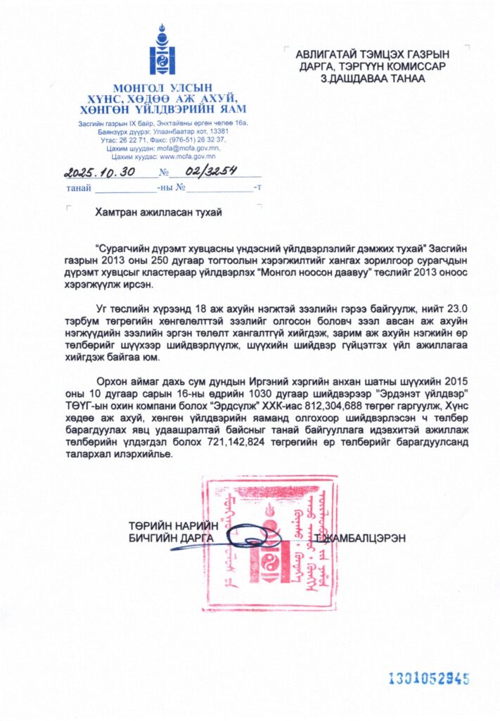 “Эрдсүлж” ХХК-иас 812.3 сая төгрөг гаргуулахаар 2015 онд шүүх шийдвэрлэсэн ч тус компани төлөөгүй аж. Авлигатай тэмцэх газрын шалгалтын дараа тус компани 721.1 сая төгрөгөө барагдуулжээ. Ийн төрд учруулсан их хэмжээний хохирлыг 12 жилийн дараа АТГ нөхөн төлүүллээ.