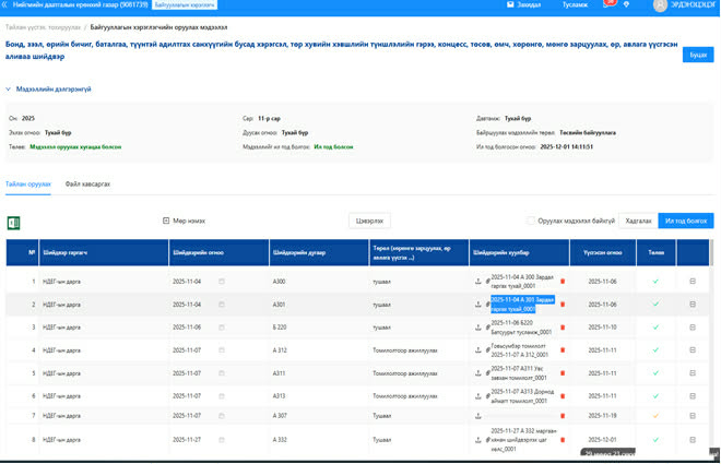 Нийгмийн даатгалын сангийн өр төлбөр барагдуулахад чиглэсэн арга хэмжээнд хууль зүйн туслалцаа үзүүлэх үйлчилгээг худалдан авах Нийгмийн даатгалын ерөнхий газар болон Дэлгэрэнгүй хууль ТББ -ын хооронд хийсэн 2025 оны НДЕГ/20250103001 дугаар “Хууль зүйн мэргэжлийн туслалцаа үзүүлэх үйлчилгээ үзүүлэх гэрээ”-ний санхүүжилтийг олгох Нийгмийн даатгалын ерөнхий газрын 2025 оны “Худалдан авах ажиллагааны зардал гаргах тухай” А/301 дүгээр тушаалыг shilendans.gov.mn –ний “Бонд, зээл, өрийн бичиг, баталгаа, түүнтэй адилтгах санхүүгийн бусад хэрэгсэл, төр хувийн хэвшлийн түншлэлийн гэрээ, концесс, төсөв, өмч, хөрөнгө, мөнгө зарцуулах, өр, авлага үүсгэсэн аливаа шийдвэр” хэсэгт 2025 оны 11 дүгээр сарын 06-ны өдөр байршуулсан болно. Тус мэдээлэлтэй холбоотой гэрээ, тушаалтай холбоотой мэдээллийг https://shilendans.gov.mn/organization/12224?ry=2025&rfor=22988&rf=1835&rm=11 линкээр орж танилцана уу.