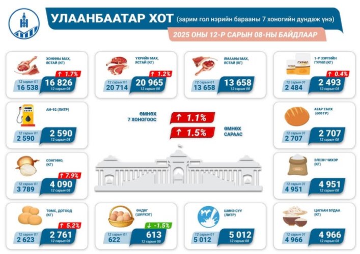 Нийслэл болон хөдөө орон нутгийн томоохон худалдааны төвүүдэд зарж буй гол нэрийн хүнсний бүтээгдэхүүний дундаж үнийн мэдээллийг арванхоёрдугаар сарын 8-ний өдрийн байдлаар Үндэсний статистикийн хороо танилцууллаа. Судалгаанаас үзвэл өргөн хэрэглээний бараа бүтээгдэхүүн өмнөх сараас 1.5 хувиар, өмнөх долоо хоногоос 1.1 хувиар өсжээ.