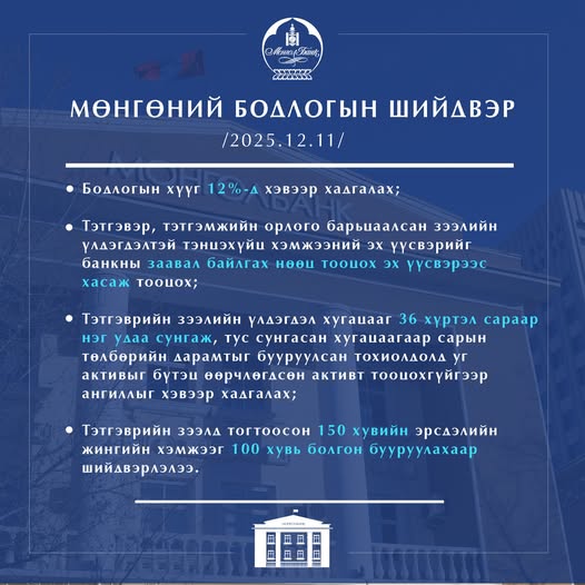 Монголбанкны Мөнгөний бодлогын хорооны 2025 оны 12 дугаар сарын 10, 11-ний өдрийн ээлжит хурлаар эдийн засаг, банк, санхүүгийн зах зээлийн өнөөгийн байдал, дотоод, гадаад орчны төлөв, эрсдэлийг харгалзан үзээд: