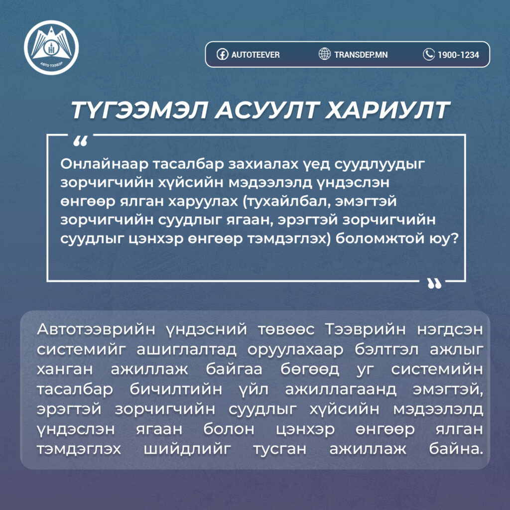 Орон нутагт зорчигчдын зүгээс Автотээврийн үндэсний төвд онлайнаар тасалбар захиалах үед суудлуудыг зорчигчийн хүйсийн мэдээлэлд үндэслэн өнгөөр ялгадаг болгох хүсэлтийг өгчээ. Харин Автотээврийн үндэсний төвөөс хүсэлтийг хүлээн авч тээврийн нэгдсэн системийг ашиглалтад оруулахаар бэлтгэл ажлыг хангаж эхэлжээ. Үндсэндээ тасалбар бичихдээ эмэгтэй, эрэгтэй зорчигчийн суудлыг хүйсийн мэдээлэлд үндэслэн ягаан болон цэнхэр өнгөөр ялган тэмдэглэхээр болжээ.