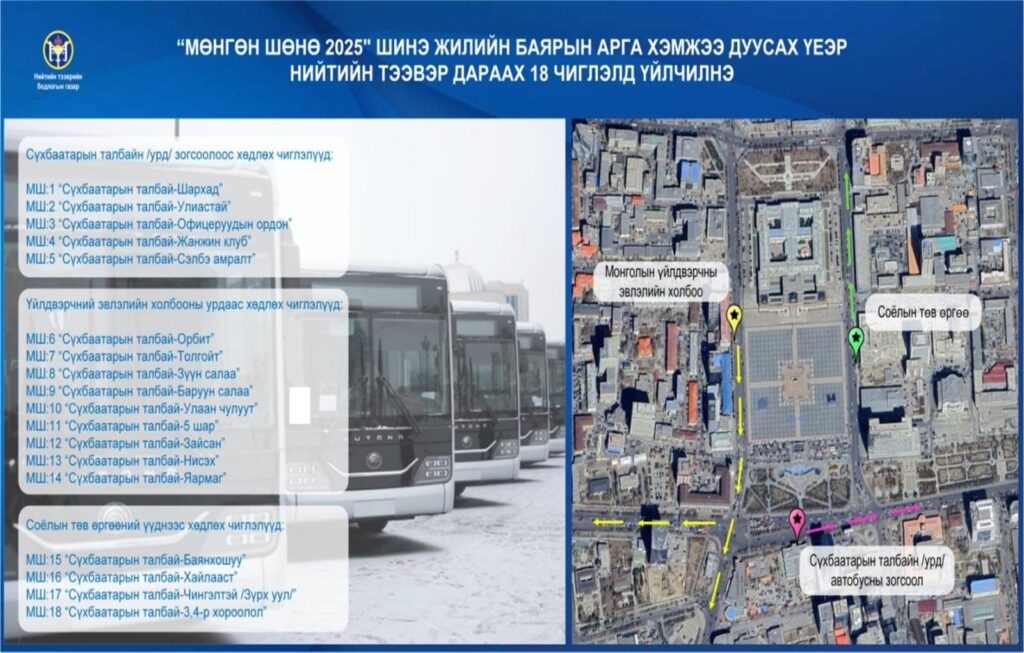 Нийслэлд Шинэ жилийн баярыг угтан, маргааш орой төв талбайд “Улаанбаатарын мөнгөн үдэш” баярын цэнгүүн болно. Энэ үеэр нийтийн тээврийн 18 чиглэлд үнэ төлбөргүй автобус явуулахаар болжээ. Автобус Сүхбаатарын талбайн баруун, зүүн болон урд зогсоолоос явах юм.