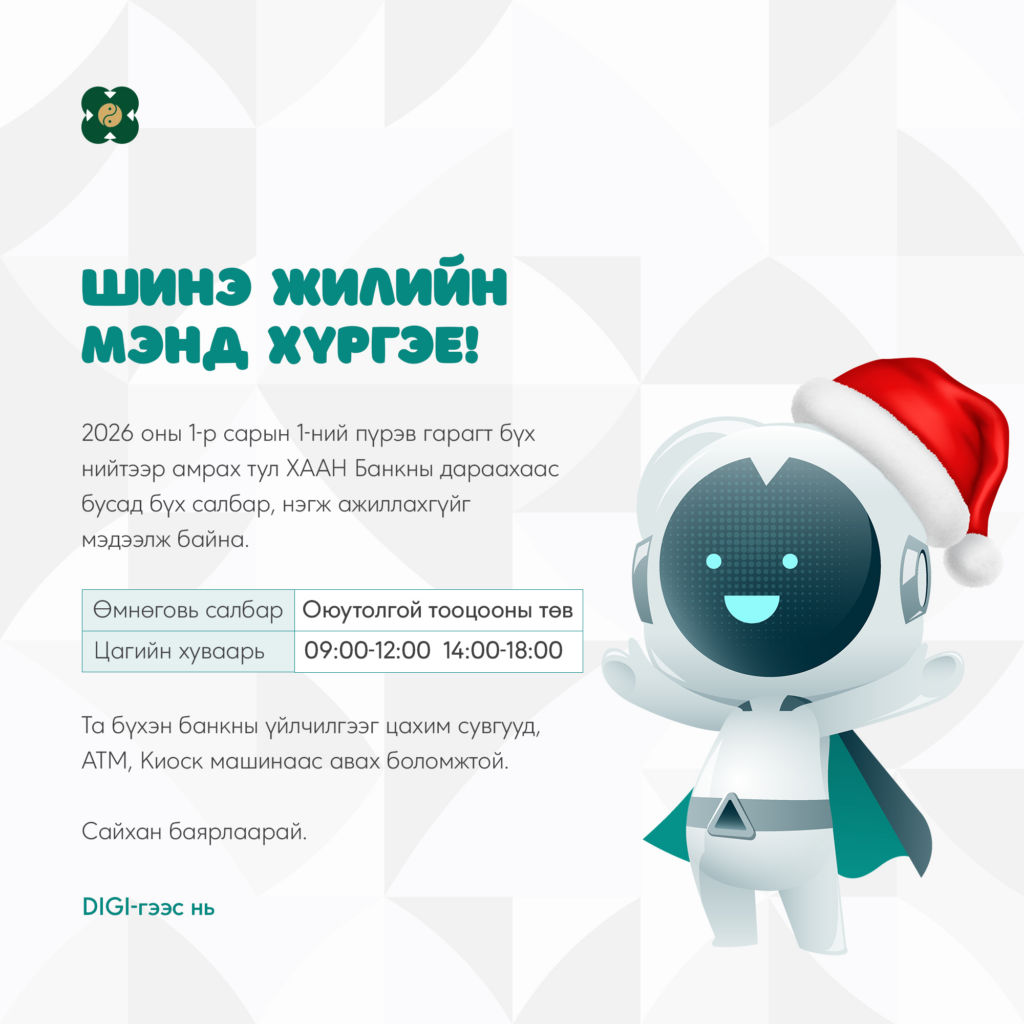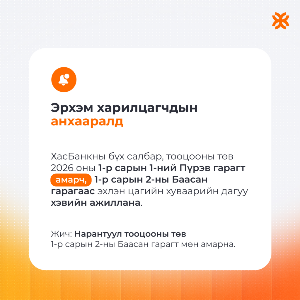 “Хас банк”-ны бүх салбар маргааш /2026.01.01/ амарч, баасан гарагаас эхлэн хуваарийн дагуу ажиллана. Харин Нарантуул тооцооны төв баасан гарагт /2026.01.02/ амарна.