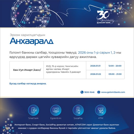 “Голомт банк”-ны Хан-Уул Имарт салбар 2026 оны 1-р сарын 01, 02-ны өдрүүдэд дараах цагийн хуваарийн дагуу ажиллана. Бусад салбар нэгжүүд амарна.