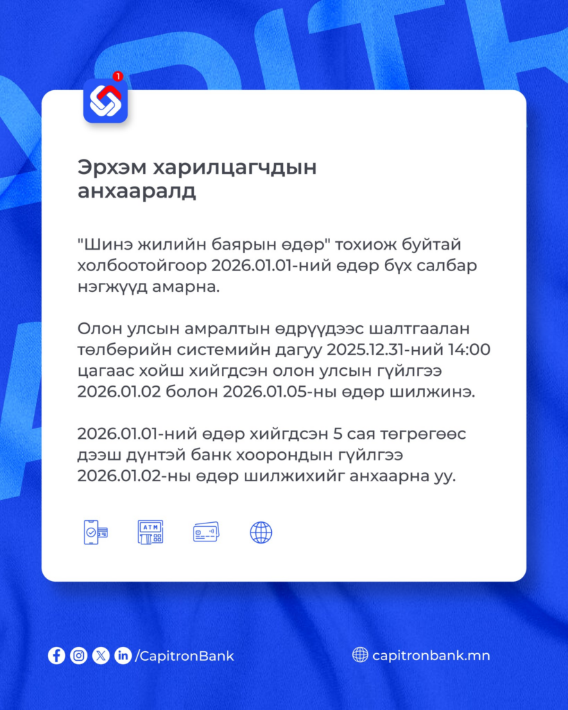“Капитрон банк”-ны бүх салбар нэгж нэгдүгээр сарын 01-ний өдөр амарна. Мөн олон улсын гүйлгээ нэгдүгээр сарын 02 болон 05-ны өдөр шилжих аж.