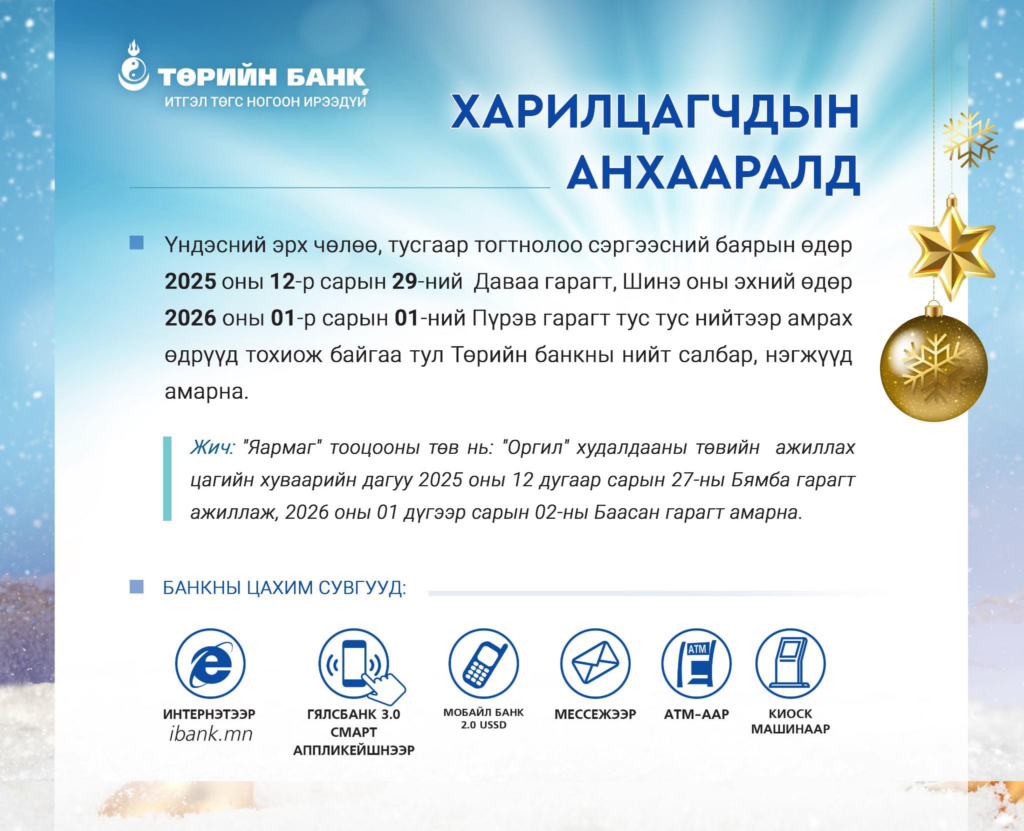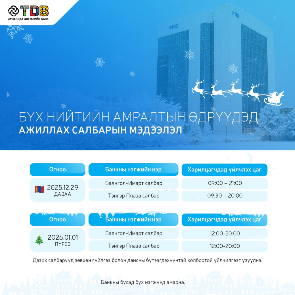 “Худалдаа хөгжлийн банк“-ны Баянгол-Имарт салбар болон Тэнгэр плаза салбар маргааш /2026.01.01/ 12:00-20:00 цагийн хооронд зөвхөн гүйлгээ болон дансны бүтээгдэхүүнтэй холбоотой үйлчилгээг үзүүлнэ. Харин бусад салбар, нэгжүүд амарна.