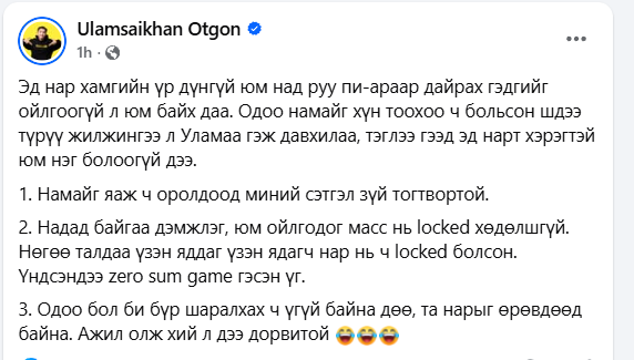 Тэгвэл О.Уламсайхан эл асуудалтай холбоотойгоор өөрийнхөө цахим хаягт байр сууриа илэрхийлжээ. Тэрээр ямар ч сэтгэл зүйн дайралтыг даваад гарах чадалтай хэмээн мэдэгдсэн байна.