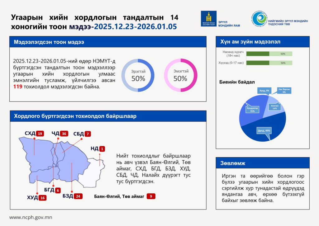 Угаарын хийн хордлогын тандалтын 14 хоногийн тоон мэдээг НЭМҮТ-өөс ирүүллээ. Тодруулбал, 2025.12.23-ны өдрөөс 2026.01.05-ний өдрийн байдлаар угаарын хийн хордлогын улмаас 119 хүн эмнэлгийн тусламж, үйлчилгээ авсан байна.
