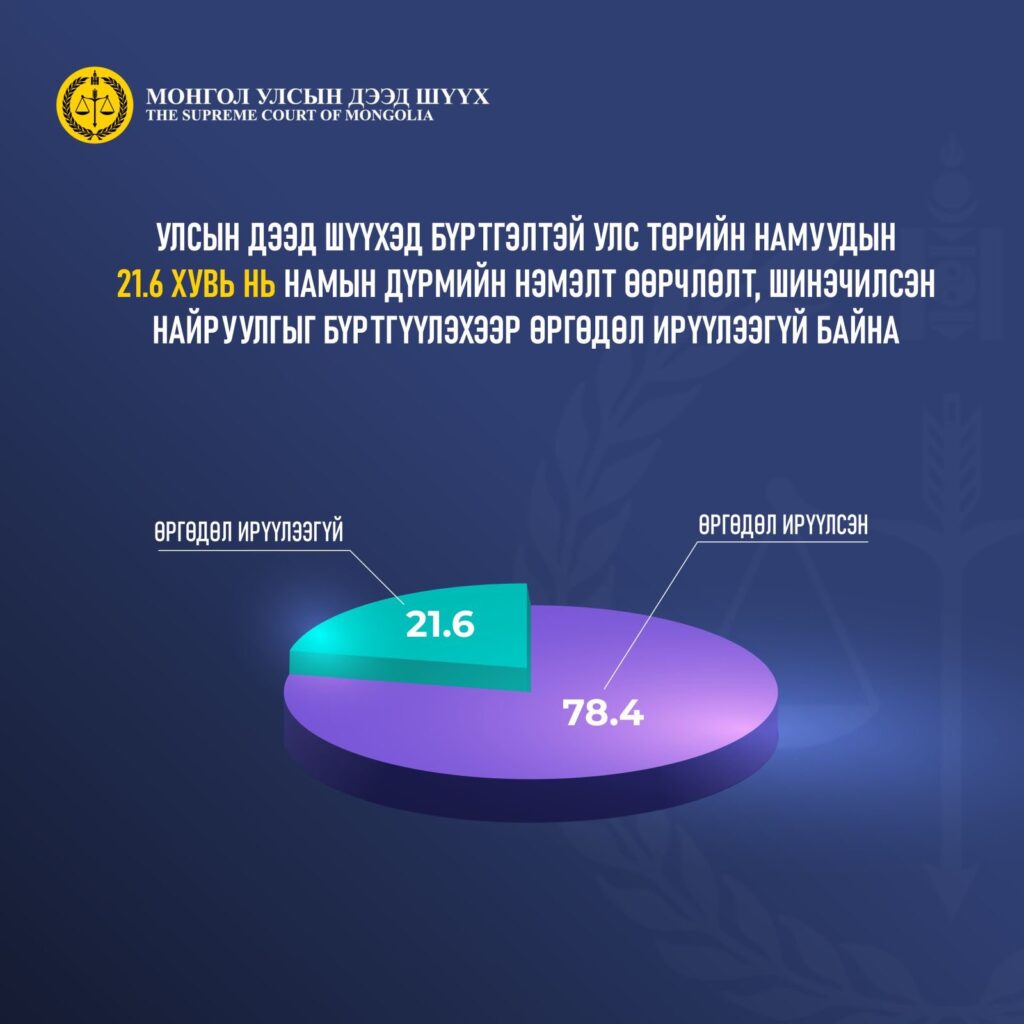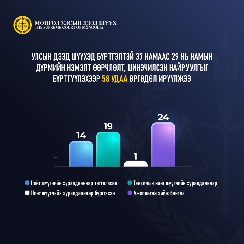 Энэ дагуу Улсын дээд шүүхийн Тамгын газрын Бүртгэлийн алба намуудаас ирсэн материалыг хүлээн авч, бүрдлийг шалган, хуваарилагдсан шүүгч, танхимд танилцуулж буй аж.
