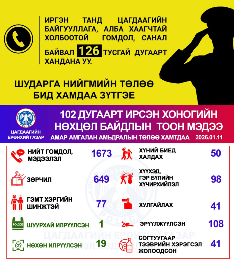 Цагдаагийн байгууллагын 102 тусгай дугаарт 2026 оны нэгдүгээр сарын 11-ний өдөр нийт 1673 дуудлага, мэдээлэл бүртгэгдсэнээс зөрчлийн шинжтэй 649, гэмт хэргийн шинжтэй 77 дуудлага мэдээлэл байна. Мөн гэмт хэргийн шинжтэй 1 үйлдлийг шуурхай илрүүлж, урьд өмнө бүртгэгдсэн 19 хэргийг нөхөн илрүүлжээ. Түүнчлэн,