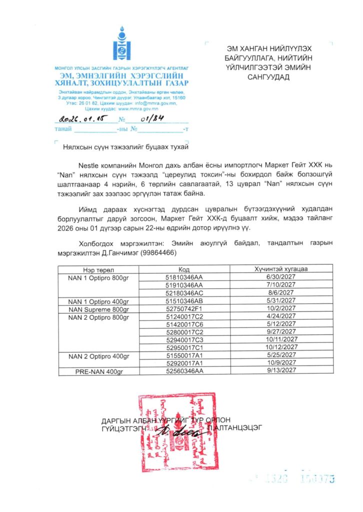 “Nestle” компанийн “NAN” нярайн сүүн тэжээлд цэреулид токсин гэх нянгаас ялгардаг хорт бодис илэрсэн байж болзошгүй аж. Иймд “NAN” сүүн тэжээлийг Монголын зах зээлд худалдахыг хориглож, дэлгүүр, худалдааны төвүүдээс уг бүтээгдэхүүнийг татан авч байна. Эргүүлэн татаж буй бүтээгдэхүүнүүдийн нэрс