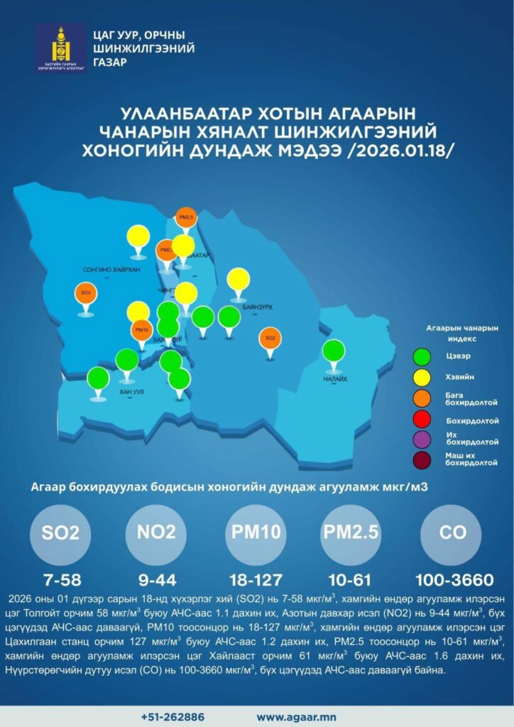 Цаг уур, орчны шинжилгээний газраас Улаанбаатар хотын агаарын чанарын мэдээг ирүүллээ. 2026 оны нэгдүгээр сарын 18-ны өдрийн байдлаар,