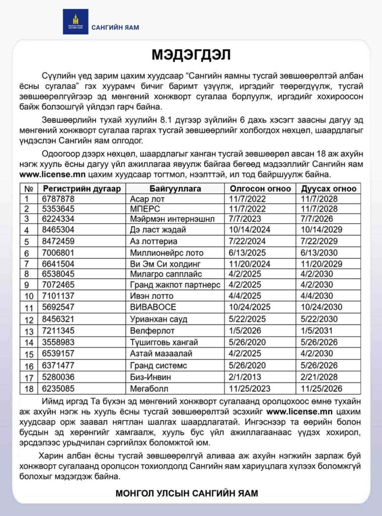 Иймд иргэд Та бүхэн эд мөнгөний хонжворт сугалаанд оролцохоос өмнө тухайн аж ахуйн нэгж нь хууль ёсны тусгай зөвшөөрөлтэй эсэхийг www.license.mn цахим хуудсаар орж нягтлан, учирч болох эрсдэлээс урьдчилан сэргийлэхийг Сангийн яам зөвлөлөө.