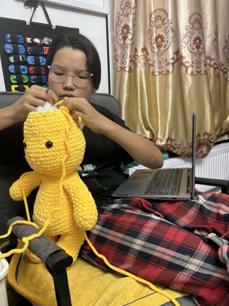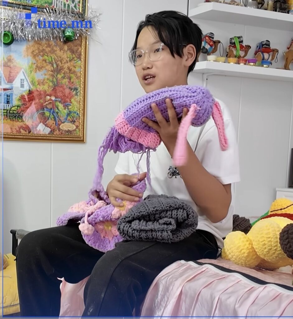 -Ихэнх цагийг нэхмэлдээ зарцуулна. Нэхэж байгаа бүтээлээ сургуульдаа аваад явчихдаг. Хичээлийн завсарлагаагаар нэхнэ. Даалгавар ихтэй үед дуусгачхаад шөнийн цагаар нэхнэ. Сонирхолтой зүйлээ хийж байгаа учраас нэг их ядардаггүй. Мөн ядрахгүй байхыг хичээдэг.