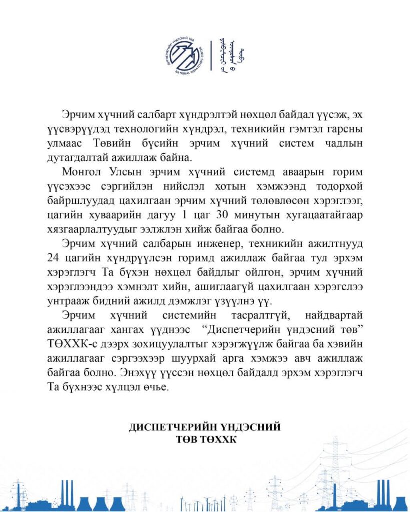 Эрчим хүчний системийн тасралтгүй, найдвартай ажиллагааг хангах үүднээс Улаанбаатар хот, Сэлэнгэ, Дархан-Уул, Төв, Дорноговь, Дундговь аймгийн хэрэглэгчдийн цахилгааныг “Диспетчерийн үндэсний төв” ТӨХХК 1.5-2 цагийн хугацаатай тасалж байна. Улаанбаатарт цахилгаан хязгаарлахад орон сууц, аж ахуйн нэгжүүдийн дулаан хамт тасарч байгаа юм.
