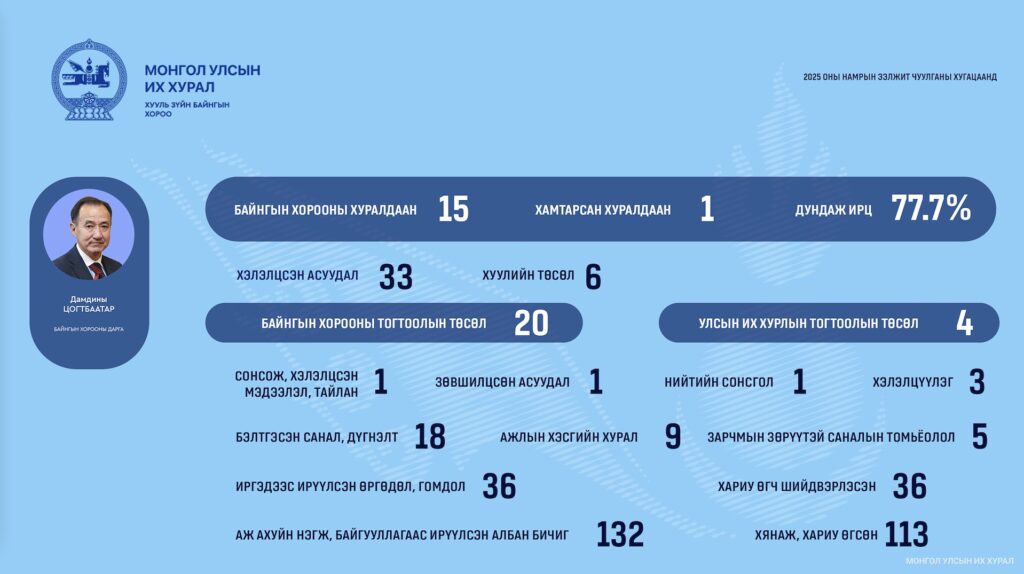 Мөн Монгол Улсын шүүхийн тухай хуульд Шүүхийн ерөнхий зөвлөлийн шүүгч бус гишүүнийг Улсын Их Хурал нээлттэйгээр нэр дэвшүүлж, сонгон шалгаруулсны үндсэн дээр нэр дэвшигчийн сонсгол хийж, томилохоор заасан. Хууль зүйн байнгын хороо 2025 оны 09 дүгээр сарын 29-ний өдөр Шүүхийн ерөнхий зөвлөлийн шүүгч бус гишүүнд нэр дэвшигчийн сонгон шалгаруулалтыг зарлах тухай Байнгын хорооны тогтоолыг баталж, сонгон шалгаруулалтыг журамд заасан найман үе шатны хүрээнд зохион байгууллаа. Сонгон шалгаруулалтаар ажлын хэсгийн гишүүдийн олонхын санал авсан нэр дэвшигчдийг Байнгын хороонд санал болгож, Хууль зүйн байнгын хороо Шүүхийн ерөнхий зөвлөлийн шүүгч бус гишүүнд нэр дэвшигчийн томилгооны сонсголыг 2025 оны 12 дугаар сарын 24-ний өдөр зохион байгуулсан тухайгаа тус тус тайлагналаа.