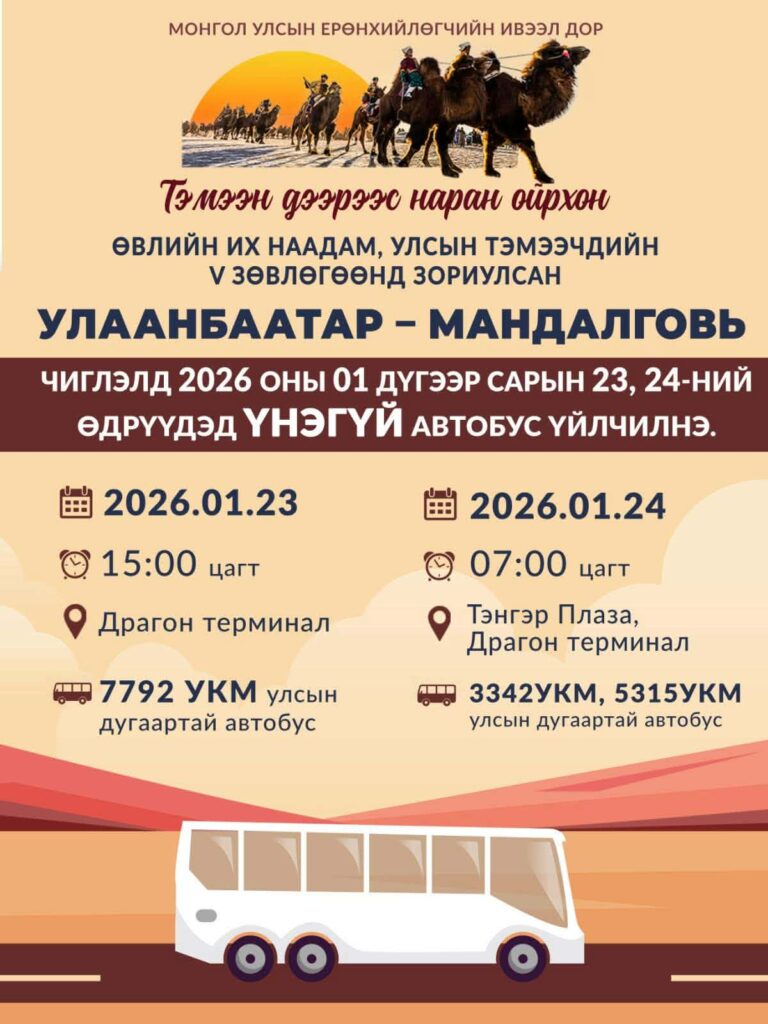 Дундговь аймагт ирэх амралтын өдрүүдэд буюу 1-р сарын 24, 25-нд “Тэмээн дээрээс наран ойрхон” өвлийн наадам, Тэмээчдийн улсын V зөвлөгөөнтэй. Уг наадмыг зорин очих иргэдийг Улаанбаатар хотоос том оврын автобусаар үнэгүй тээвэрлэх юм байна. Эхний автобус өнөөдөр 15:00 цагаас “Драгон”-оос хөдөлнө. Дараагийн автобус маргааш өглөө 07:00 цагт “Тэнгэр плаза”-гаас явна.