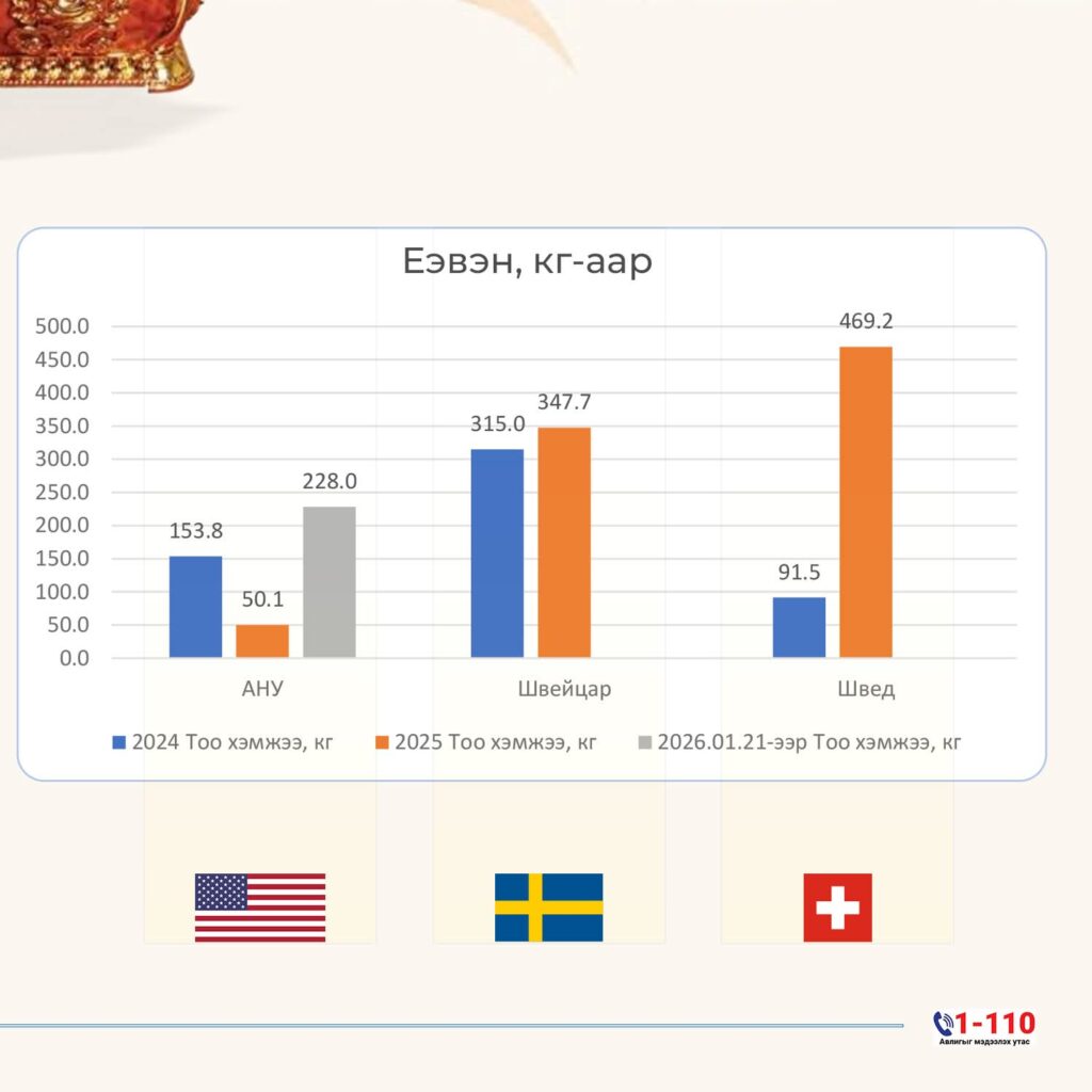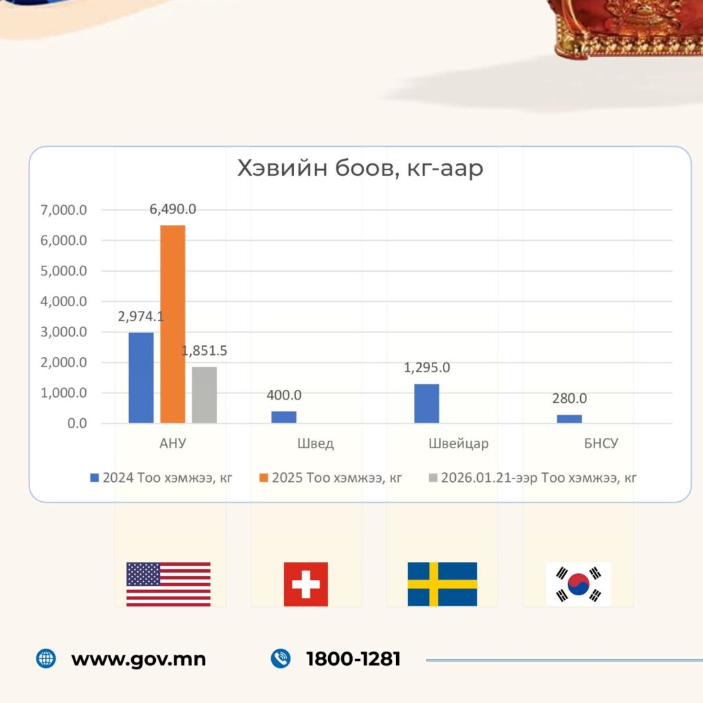 Манай улс 2024 онд Швед, Швейцар, БНСУ руу нийт 1975 кг хэвийн боов экспортолсон бол сүүлийн 3 жилд АНУ руу байнга гаргаж байна.
