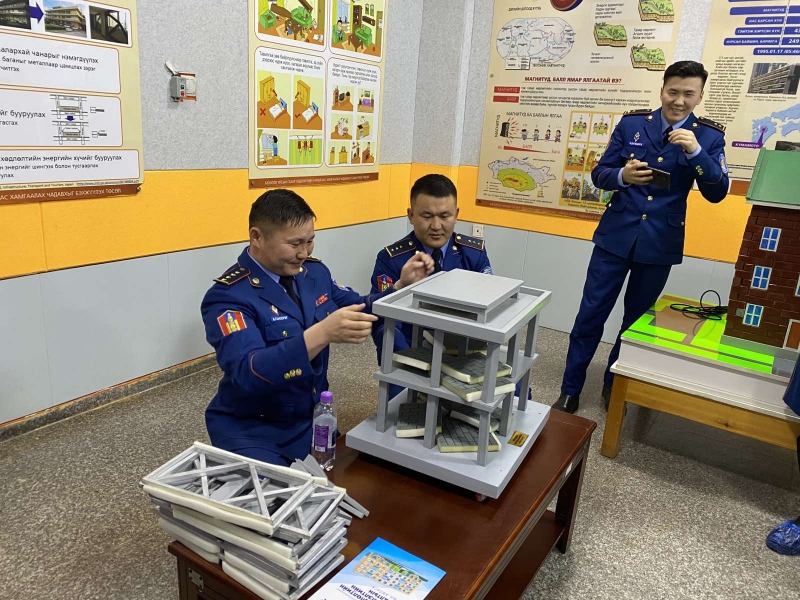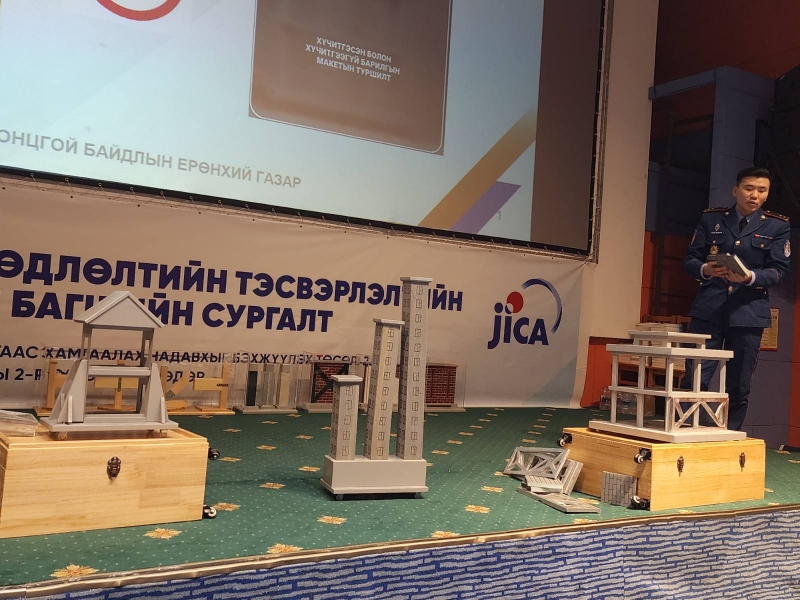 Онцгой байдлын ерөнхий газар, Япон Улсын ЖАЙКА байгууллага хамтран хэрэгжүүлж буй “Монгол Улсын газар хөдлөлтийн гамшгаас хамгаалах чадавхыг бэхжүүлэх төсөл 2″-ын хүрээнд газар хөдлөлтийн тэсвэршилтийн сургалт, дадлагын хэрэглэгдэхүүн (макет) болон гарын авлага боловсруулаад байна. Төслийн хоёрдугаар үе шатанд төв, орон нутгийн сургалтын мэргэжилтнүүдийг үе шаттайгаар бэлтгэж байгаа юм. Энэ удаагийн сургалтаар барилгын тэсвэршилт, хүчитгэл, эрсдэлийг бууруулах талаар сэдэвчилсэн сургалт, дадлагыг зохион байгуулж, сургалт хариуцсан мэргэжилтнүүдийн мэдлэг, чадавхыг бататгалаа.