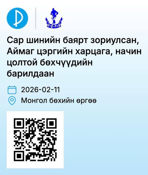 Монгол бөхийн холбооноос сар шинийн баярын барилдаанд зориулан аймаг, цэргийн харцага, начин цолтонгуудыг бүртгэж эхэллээ. Аймаг, цэргийн харцага, начин цолтой бөхчүүдийн барилдаан хоёрдугаар сарын 11-ний 11:00 цагаас МБӨ-нд болох юм. Бүртгэлийг дараах линк холбоосоор хийх юм.