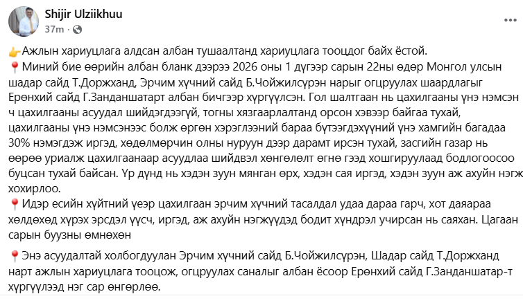 УИХ-ын гишүүн Ө.Шижирийн зүгээс : “Асуудлыг улирлын чанартайгаар биш, бодлогын түвшинд, хариуцлагын зарчмаар шийдвэрлэх ёстой. Төрийн өндөр албан тушаалтнууд бодит хариуцлага хүлээдэг тогтолцоо байхгүй бол ижил асуудал давтагдсаар байх болно. Ерөнхий сайдаа хуулийн хугацаандаа албан бичгийнхээ хариуг авъя” гэжээ.