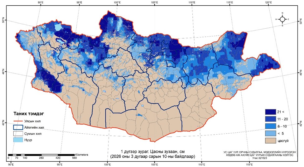 Ус цаг уур, орчны судалгаа, мэдээллийн хүрээлэнгээс арав хоногт нэг удаа хийдэг хээрийн цасны хэмжилтийн мэдээгээр гуравдугаар сарын 10-ны байдлаар нийт нутгийн 45 хувьд цастай байна. Цасны зузаан Увсын Хяргас, Цагаанхайрхан, Завханы Цэцэн-Уул, Нөмрөг, Баян-Уул, Хөвсгөлийн Цэцэрлэг, Сэлэнгийн Ерөө, Хүдэрт 31-38 см буюу хамгийн зузаан цастай байна. Цасан бүрхүүлийн хэмжээг өмнөх арав хоногтой харьцуулахад 20 хувиар буурсан байна.