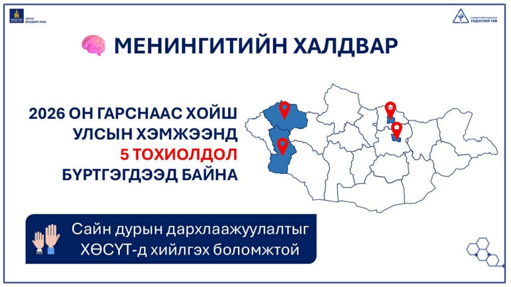 Менингококкт халдвар буюу цахилгаан менингит өвчний улмаас өчигдөр Ховд аймагт 1 хүүхэд нас баржээ. Улсын хэмжээнд 3-р сарын 5-ны өдрийн байдлаар 5 хүүхэд менингококкт халдвар туссан нь батлагдаад байна. Насны хувьд 6 сартайгаас 10 насны хүүхдийн дунд энэ өвчин түгээмэл байгаа аж. Ингэхдээ 66.7 хувь нь 5 хүртэлх насны хүүхэд байна гэж ХӨСҮТ мэдээллээ.
