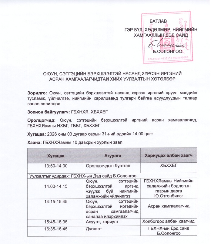 Гэр бүл, хөдөлмөр, нийгмийн хамгааллын яамны дэд сайд Б.Солонгоо “Оюуны болон сэтгэцийн бэрхшээлтэй насанд хүрсэн иргэний асран хамгаалагчидтай хийх уулзалт”-ыг 2026 оны 03 дугаар сарын 31-ний өдөр зохион байгуулахаар болжээ. Уулзалт Гэр бүл, хөдөлмөр, нийгмийн хамгааллын яамны байранд болох юм. Уулзалтад хамрагдах иргэд бүртгүүлэх шаардлагатай санууллаа. Ингэхдээ Хөгжлийн бэрхшээлтэй хүний хөгжлийн ерөнхий газрын 703 тоотод биечлэн ирэх, мөн 77073001 дугаарт холбогдож бүртгүүлэх боломжтой аж.