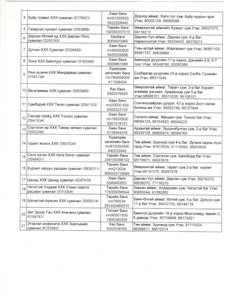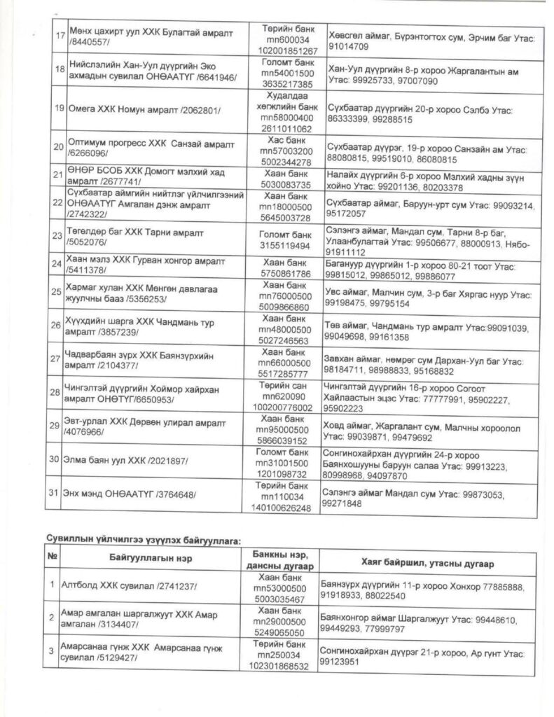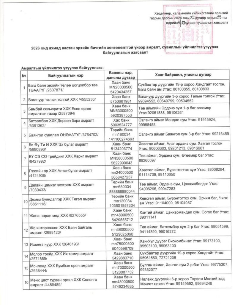 2026 онд дараах сувиллын газрууд ахмад настнуудад хөнгөлөлттэй үнээр үйлчлэхээр Хөдөлмөр, халамжийн үйлчилгээний ерөнхий газартай гэрээ байгуулжээ.