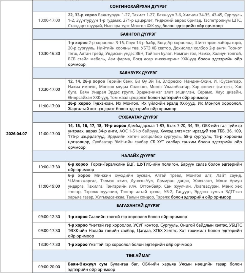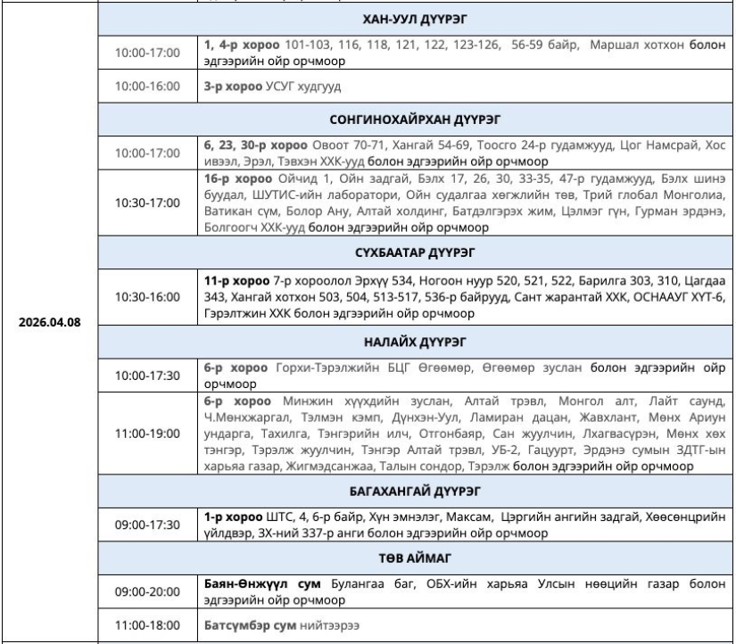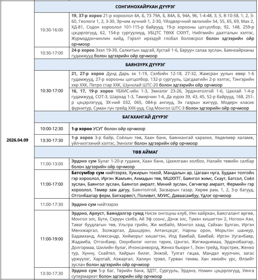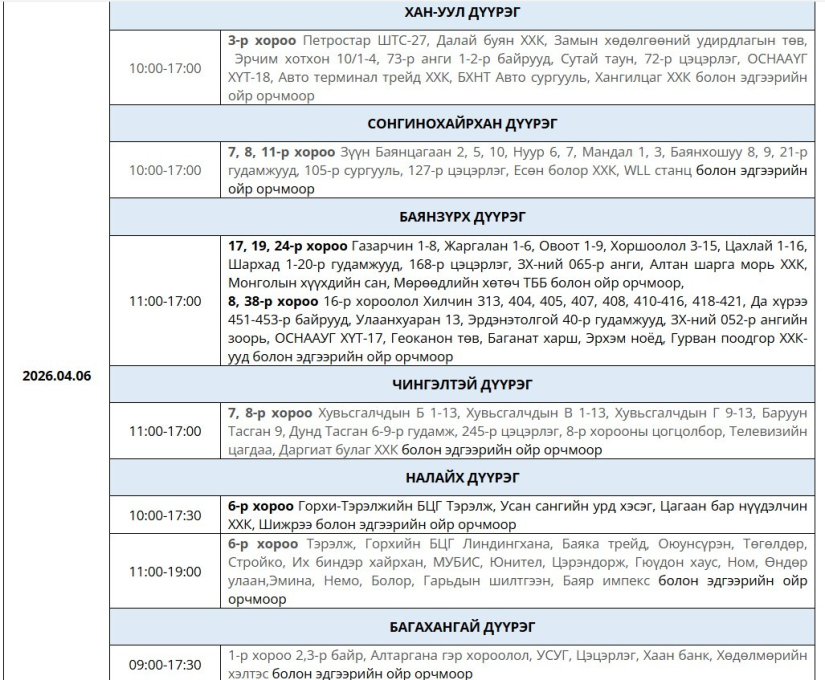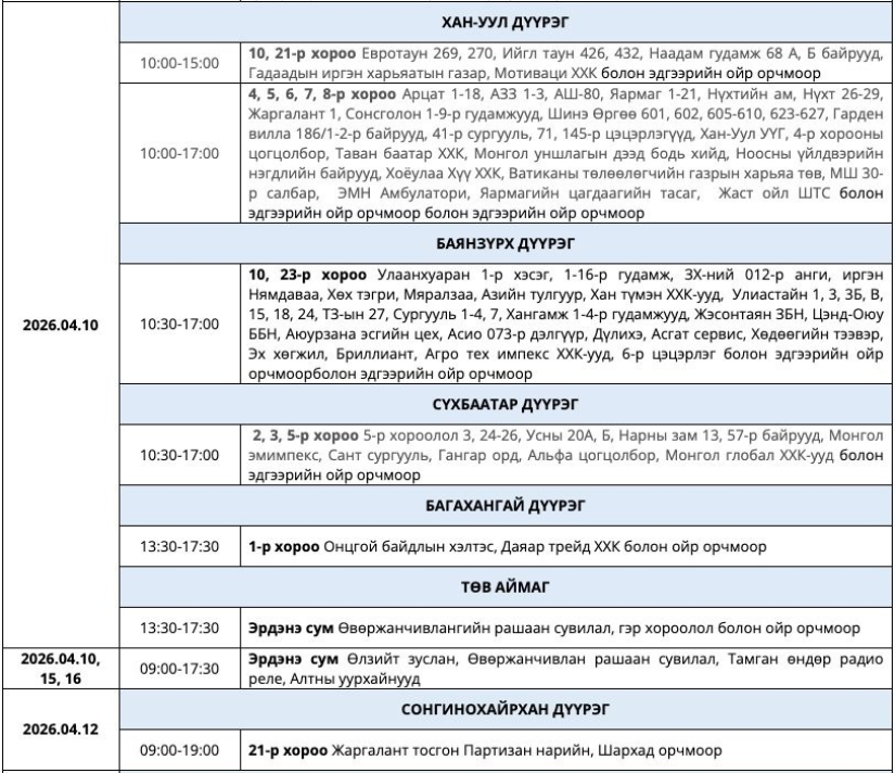 УБЦТС ТӨХК дөрөвдүгээр сард цахилгаан шугам, тоноглолд хийх төлөвлөгөөт засварын ажлын хуваарийг танилцууллаа. Тус хуваарийн дагуу энэ долоо хоногт буюу дөрөвдүгээр сарын 6-12-нд Улаанбаатар хотын зарим байршилд цахилгаан түр хязгаарлах юм. Энэ нь шугам сүлжээний найдвартай ажиллагааг хангах, осол аваараас урьдчилан сэргийлэх зорилготой. Засварын үеэр тодорхой байршилд өдөр, цагийн хуваарийн дагуу хэрэглээг түр зогсооно.