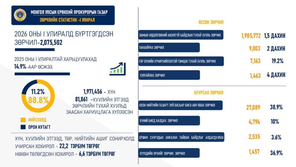 Улсын Ерөнхий Прокурорын газар 2026 оны нэгдүгээр улирлын байдлаар нийт 2,075,502 зөрчил бүртгэжээ. Үүнийг өмнөх оны мөн үетэй харьцуулахад 14.9 хувиар өссөн байна.Нийт зөрчлийн 88.8 хувь нь нийслэлд,12.2 хувь нь орон нутагт үйлдэгджээ.