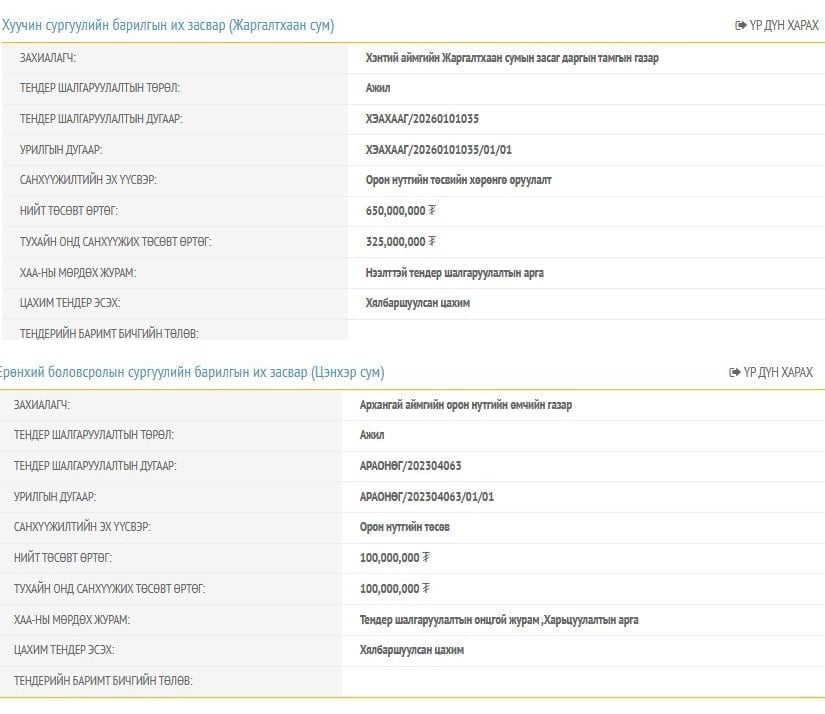 2023 оноос хойш сургууль, цэцэрлэгийн их засварын өртөг орон нутагт хэт нэмэгдэж. Тухайлбал: Хэнтий аймгийн Жаргалтхаан сумын сургуулийн их засварын өртөг 650 сая төгрөг бол 2023 онд Архангай аймгийн Цэнхэр сумын сургуульд 100 сая төгрөгөөр их засвар хийжээ.Ийм өртөг өндөртэй тендерийн гүйцэтгэл, чанарыг хэн хянадаг юм бэ?