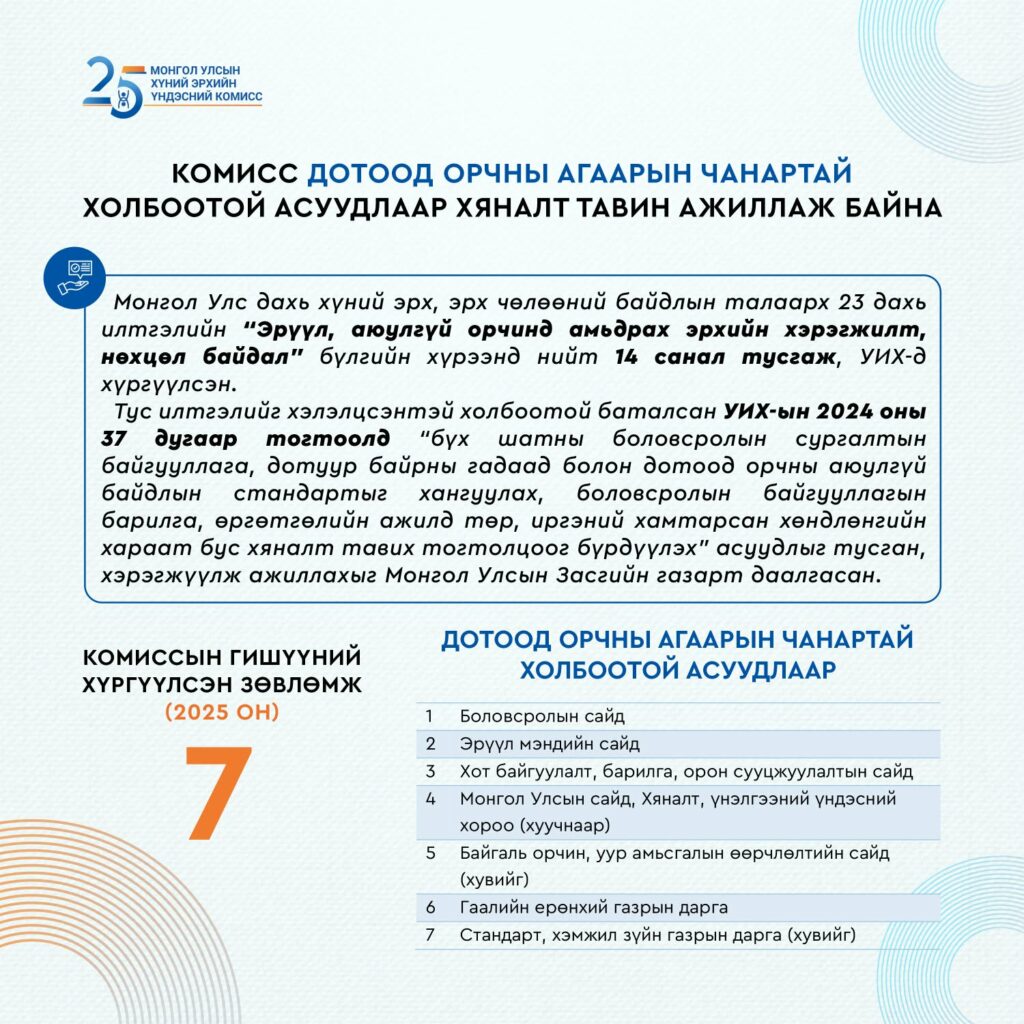 Хүний эрхийн үндэсний комиссын 23 дахь илтгэлд дүгнэсэн дотоод орчны агаарын бохирдол, эрүүл, аюулгүй орчинд амьдрах эрхийн хэрэгжилттэй холбоотой тулгамдсан асуудлууд бүрэн шийдвэрлэгдээгүй, тодорхой ахиц дэвшил өнөөдрийг хүртэл гараагүй байгаа аж. Иймд УИХ-ын 2024 оны 37 дугаар тогтоолд тусгаагүй асуудлаар 2025 онд Боловсролын сайд, Эрүүл мэндийн сайд, Хот байгуулалт, барилга, орон сууцжуулалтын сайд, Байгаль орчин, уур амьсгалын өөрчлөлтийн сайд, Монгол Улсын сайд, Хяналт, үнэлгээний үндэсний хороо (хуучнаар), Гаалийн ерөнхий газрын дарга, Стандарт, хэмжил зүйн газрын дарга зэрэг холбогдох 7 байгууллагын удирдлага, албан тушаалтанд ХЭҮК-ын гишүүний зөвлөмжийг хүргүүлсэн байна. Тус комисс дотоод орчны агаарын чанартай холбоотой асуудлыг тогтмол анхаарч, бодлогын түвшинд дэвшүүлэн тавьж ирсэн боловч хэрэгжилт хангалтгүй байгаа тул холбогдох төрийн байгууллагуудын уялдаа холбоо, хариуцлагыг нэмэгдүүлж, авч хэрэгжүүлэх арга хэмжээг эрчимжүүлэх шаардлагатай байгаа талаар мэдэгджээ. Өнгөрсөн хугацаанд та бидний хүүхдүүд сурч боловсордог сургууль, цэцэрлэгийн дотоод орчны агаарын чанарын асуудал хэнд ч хамааралгүй байсаар иржээ.