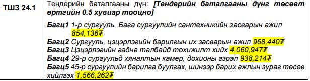2025 онд Сүхбаатар дүүргээс зарласан 3 сургууль, 2 цэцэрлэгийн 1 тэрбум 677 сая төгрөгийн тендерээс зөвхөн их засвар хийх цэцэрлэгийн төсөвт өртөг нь 193 сая байв. Үүнээс 3-4 саяыг нь будганд зарцуулдаг гэнэ. 2025 онд сургууль, цэцэрлэгийн засварт 20.5 тэрбум төгрөг төсөвлөсөн байна. Санхүүжилтийг дүүрэг, нийслэлийн төсвөөс гаргажээ. Энэ дүн харилцан адилгүй байх жишээний.
