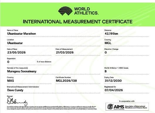 “Улаанбаатар марафон” олон улсын гүйлтийн замыг Дэлхийн хөнгөн атлетикийн холбооноос албан ёсоор хэмжиж, баталгаажуулан Монголын хөнгөн атлетикийн холбоонд хүлээлгэн өглөө. Ингэснээр “Улаанбаатар марафон” нь олон улсын стандарт шаардлагад нийцсэн, албан ёсны баталгаажсан замтай болж, марафон гүйлтийн спортын цол, зэрэг олгох боломж бүрдэн, олон улсын өндөр зэрэглэлийн тамирчдыг хүлээн авах эрхтэй боллоо. Энэхүү ажлыг амжилттай хэрэгжүүлэхэд нийслэлийн Засаг даргын Тамгын газар, нийслэл, дүүргийн Биеийн тамир, спортын газар, хороод, Монголын хөнгөн атлетикийн холбоо, “Хайпэй” ХХК, багш, дасгалжуулагч, тамирчид хамтран ажиллалаа.