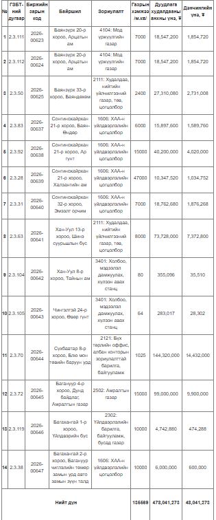 Дуудлага худалдаанд оролцогч бүртгүүлэх хүсэлтээ 2026 оны 04 дүгээр сарын 30-ны өдрийн 09:00 цагаас эхлэн 05 дугаар сарын 06-ны өдрийн 15:00 цагийн хооронд газрын биржийн цахим систем WWW.MLE.MN-д илгээн баталгаажуулсан байна