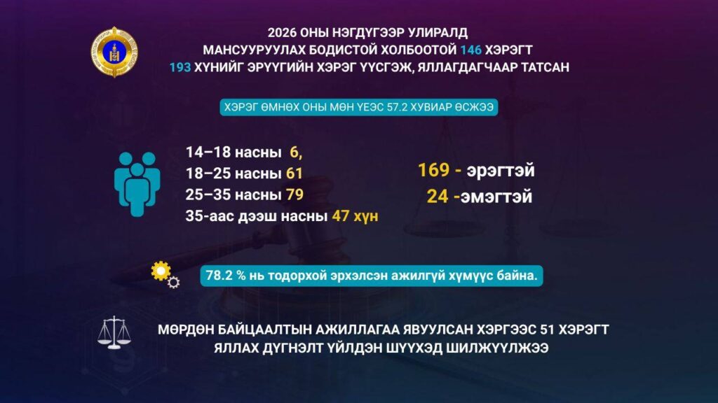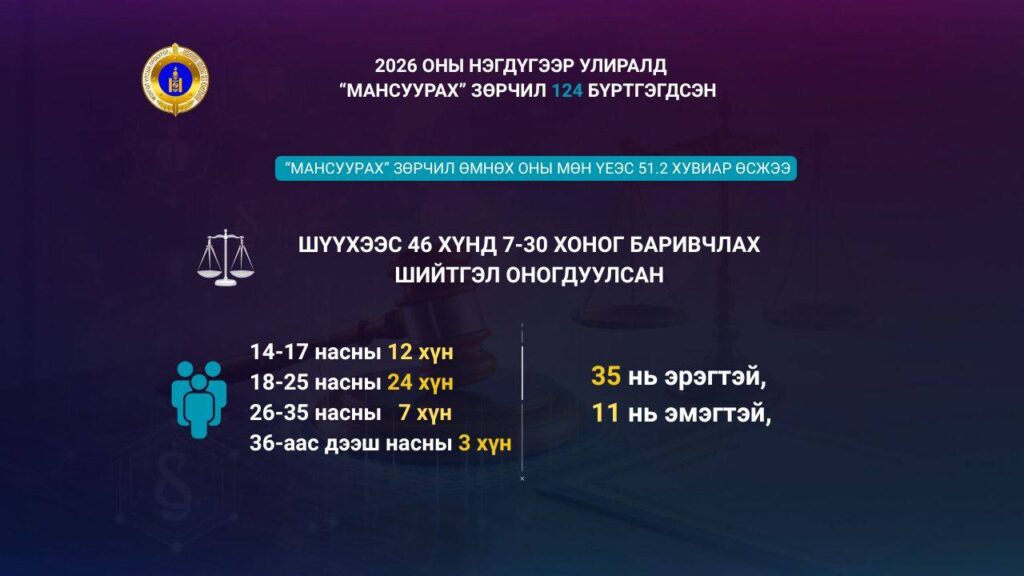 2026 оны нэгдүгээр улиралд мансуурах зөрчил 124 бүртгэгдсэн нь өмнөх оны мөн үеэс 42 хэргээр буюу 51.2 хувиар өсжээ.