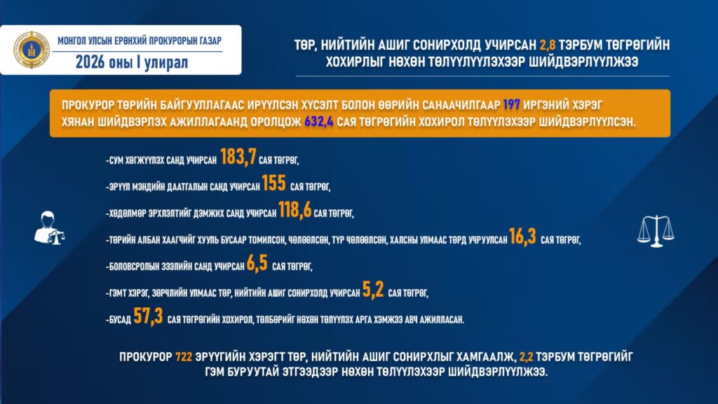 Прокурорын байгууллага 2026 оны нэгдүгээр улиралд төр, нийтийн ашиг сонирхлыг хамгаалах чиг үүргийн хүрээнд төрийн байгууллагаас ирүүлсэн хүсэлт болон өөрийн санаачилгаар 197 иргэний хэрэг хянан шийдвэрлэх ажиллагаанд нэхэмжлэгч, гуравдагч этгээдээр оролцон 632,4 сая төгрөгийн хохирол нөхөн төлүүлэхээр шийдвэрлүүлсэн.