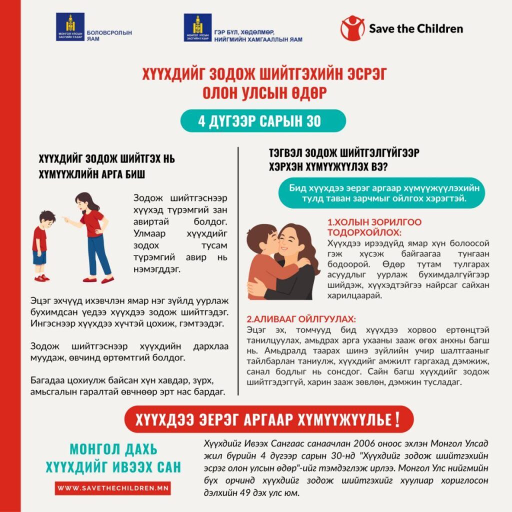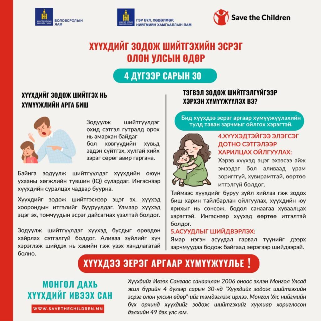 Монгол Улс нийгмийн бүх орчинд хүүхдийг зодож шийтгэхийг хуулиар хориглосон дэлхийн 49 дэх улс юм. Энэ өдөр дэлхийн улс орнуудад эцэг, эхчүүдийг хүүхэдтэйгээ хэрхэн харилцаж, хэрхэн хүмүүжүүлж байгаагаа эргэцүүлэн бодохыг, хүүхэд хүмүүжүүлэх эерэг аргуудыг эрэлхийлэхийг хүн бүрд уриалдаг юм. Монгол Улс бүх орчинд хүүхдийг зодож шийтгэхийг хуулиар хориглосон байдаг. Хүүхэд хамгааллын тухай хуулийн 22 дугаар зүйлийн 22.4-т “Эцэг, эхэд хүүхэдтэй холбоотой эрхээ урвуулан ашиглах, хүүхдийг үл хайхрах, зүй бус харьцах, бие махбодын шийтгэл хэрэглэх, гутаан доромжлохыг хориглоно” гэж заасан. Монгол Улсад 2006 оноос энэхүү өдрийг тэмдэглэн олон нийтэд танилцуулж хүүхдийг эерэг аргаар хүмүүжүүлэхийг уриалсаар иржээ.